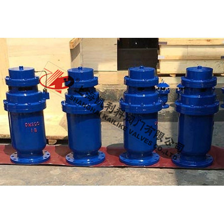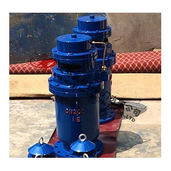 QSP全壓高速排氣閥由下閥體,中閥體,浮筒,浮筒桿,閥芯,蓋板,活塞桿,膜片及閥蓋等組成的全壓高速排氣閥,其特征是通過銷軸與浮筒鉸接的浮筒桿可繞主軸轉(zhuǎn)動,并由此實現(xiàn)通過浮筒升降控制閥芯的升降啟閉,即當(dāng)浮筒下降(閥體里充滿氣體)時,閥芯上升,打開小閥口,并關(guān)閉小排氣帽上的排氣口,使氣體通過導(dǎo)管進(jìn)入液壓罐內(nèi),當(dāng)浮筒在浮力作用下上升時候,閥芯下降,關(guān)閉小閥口,同時打開排氣帽上的排氣口,使液壓罐通過導(dǎo)管,直通大氣泄壓,且當(dāng)浮筒下降,液壓缸內(nèi)充滿氣體時,閥門上的大排氣口自動關(guān)閉。當(dāng)水泵停止,管內(nèi)水流空時或遇到管內(nèi)產(chǎn)生負(fù)壓時,吸入空氣,確保管線安全。