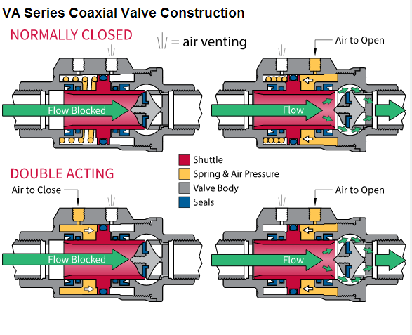 閥2同軸的位置,閥可以是氣動或電動地驅動。電動版本使用電磁線圈和彈簧,類似于螺線管閥。該版本使用氣動空氣壓力和彈簧(彈簧復位),或空氣壓力在兩個方向(雙向)。使用同軸閥往復型障礙物,穿過介質時打開。該傳送裝置移動到一個位置或另一個來執行其功能,或者開/關或分流流量到適當的出口。同軸閥(10)具有更大的流動通道的電磁閥相比,但仍然沒有完全的閥端口。那是真的,又有一個限制流量和壓力損失的增加。有風格多樣的同軸閥。兩個例子是VA系列氣動操作閥的開/關VAX系列電動或氣動同軸閥可在2-3開/關方式或雙向分流。對于許多應用同軸ON/OFF閥使代替球形閥。同軸閥將提供較小的閥更快操作的球閥將典型地具有較高的流速與壓降較低。