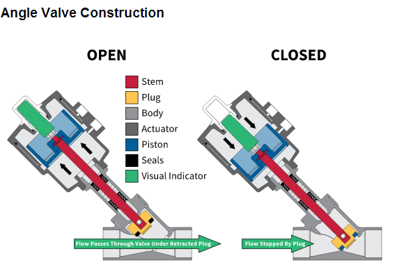 座椅角度的閥位置的閥2與內置的氣動執行器。所述致動器可以被返回彈簧作用或雙作用的。脫膜劑為插頭進入閥角度坐在傾斜座椅模制到所述閥的流動路徑。所述插頭被幾乎完全縮回時的流動路徑打開。這一因素使座椅角度閥門的最高流量快速作用閥具有最低的壓降。在許多應用中打開/關閉,閥座的閥角度的完美替代品。他們采取快、成本更低并且持續時間更長。