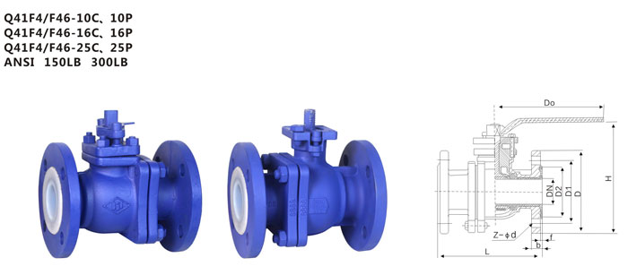 Q41F46襯氟球閥可分為對分二片式和三片式兩種結構型式,除具有的流體阻力小,啟閉速度快,結構簡單外,采用FEP襯里層的球閥具有極高的化學穩定性可以適用除“熔融堿金屬和元素氟”,以外